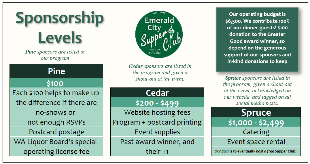 Our fundraising model is unique in that our dinners are not auctions, and are free to attend. Our only source of revenue is the registration fee ($20/person), which means we depend heavily on the generosity of both in-kind and monetary donations to host the dinner, sponsor a volunteer, and keep the necessary year-round operations running smoothly. Below is a breakdown of what your sponsorship dollars can support.
